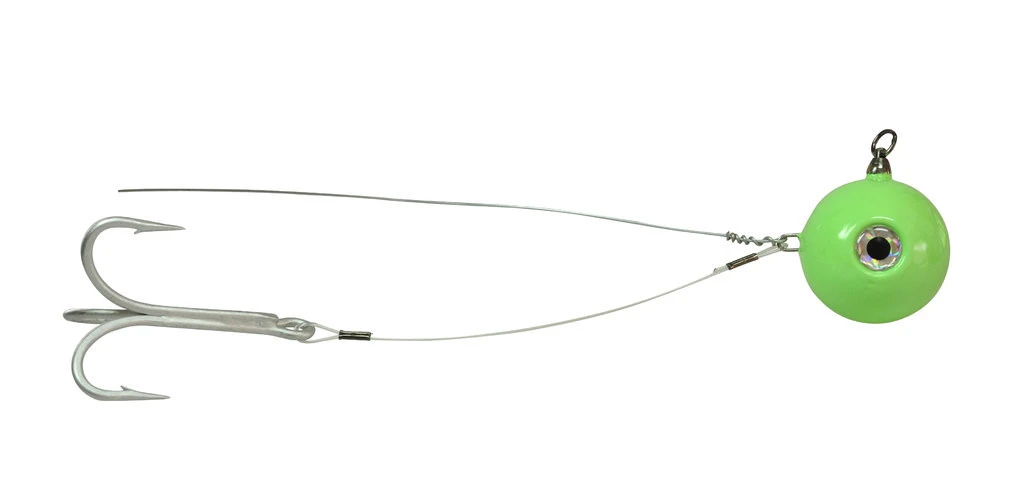 Dieses System ist dafür entwickelt Köderfische zu präsentieren. Damit bringen Sie die Köderfische in Grundnähe und präsentieren diesen dort in der Strömung oder Drift. Die Bait-Balls sind mit 200lbs Kugellagerwirbeln fertig montiert. Durch diesen dreht sich der Bait-Ball immer in die Strömung und der Köderfisch präsentiert sich perfekt. Das System besteht ebenfalls aus 200lbs Material als Köderaufnahme und Anbissstelle. Durch den Draht wird der Köderfisch am Bait-Ball fixiert und er wird immer aufrecht und naturgetreu präsentiert. Der Drilling von VMC besteht aus Perma Steel Material und wir in die Flanke des Köderfisches gesteckt. Dem Köderfisch brechen wir zwei, dreimal die Gräte, damit er sich richtig natürlich bewegt. Das Bait-Ball System gibt es in fünf Grammaturen von 200g bis 600g.