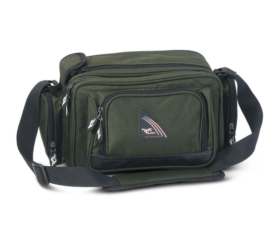 Diese sehr schöne Ködertasche wird mit zwei Sortimentsboxen geliefert. Die Maße der Tasche sind 40x24x21cm. Sie besitzt einen gepolsterten Schultertragegurt und drei Aufsatztaschen. Sie ist rundum gepolstert und besteht aus wasserabweisendem 600D Nylon. Als Ersatzboxen passen die Iron Claw Gear Boxen vom Typ 2.