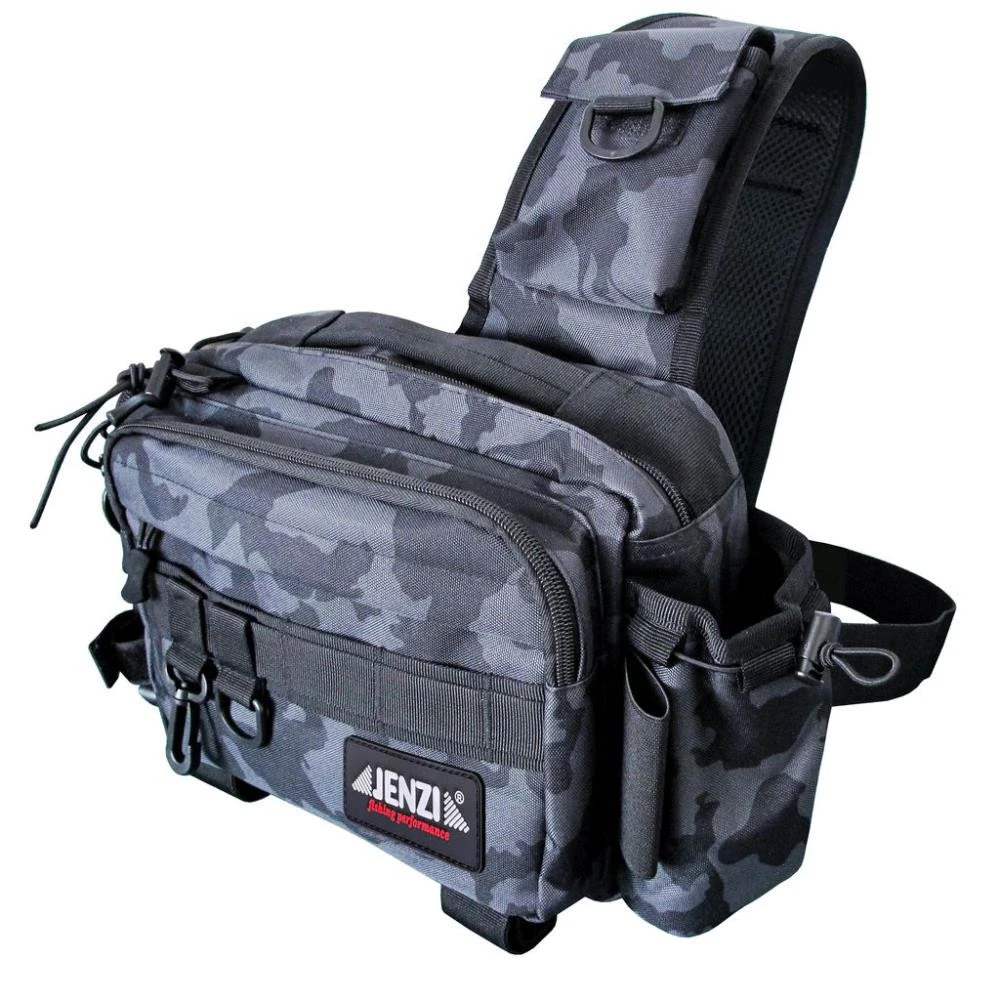 Die Camou Sling Bag (Schultertasche) ist speziell für das mobile Angeln konzipiert worden. Verschiedene Taschen, Clips, Halterungen sorgen für ein problemloses und durchdachtes Angeln. Die Tasche kann von der Seite zur Front gedreht werden, um ideal an das Tackle zu kommen. Während dem Angeln stört sie nicht, da sie an der Seite getragen werden kann. Das Material ist wasserabweisend und sehr strapazierfähig.