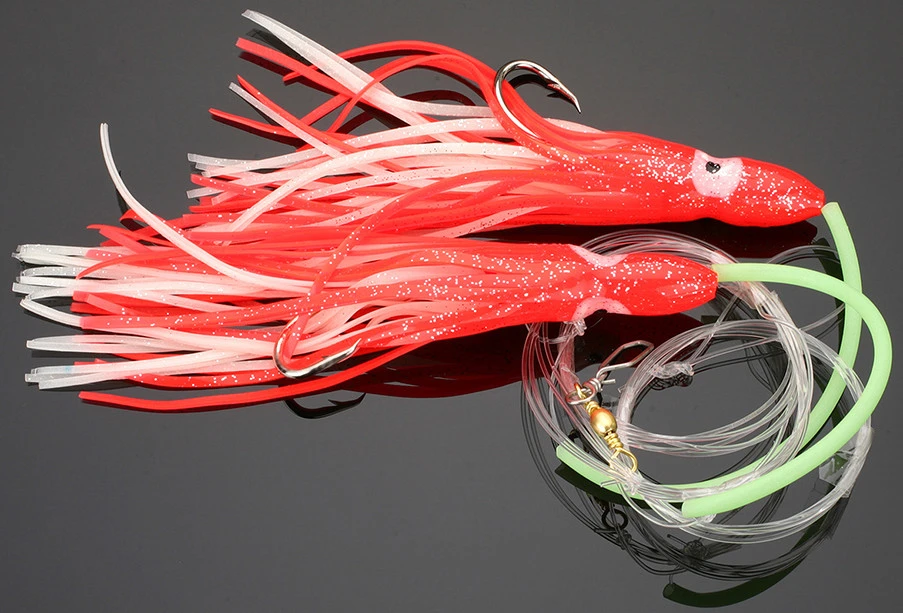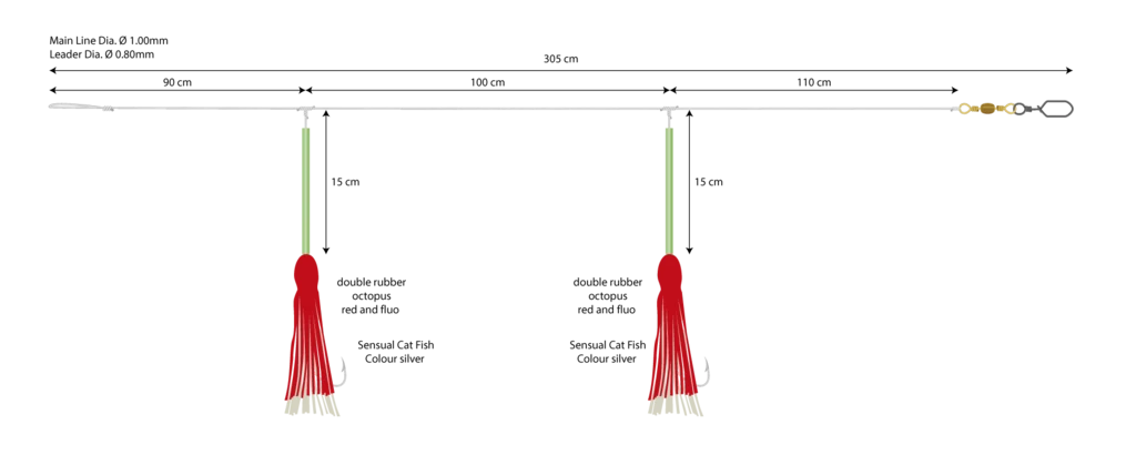 Dies ist ein System mit zwei Einzelhaken, Oktopussen in rot-fluo und Leuchtschlauch, perfekt für Seehecht, Dorsch und Seelachs. Das Rig muss einige Meter über dem Boden mit einem hohen Gewicht von bis zu 800g geführt werden. Die Haken werden mit Fischfetzen beködert. Bei diesem System muss ein Anhieb gesetzt werden. Es ist 305cm lang und die Hauptschnur hat eine Stärke von 1,00mm und die Vorfachschnur von 0,80mm. Das System nicht nur am Grund angeln, sondern ruhig auch mal ein paar Kurbelumdrehungen mit „Stopps“ machen, bis man so ca. 30m über dem Grund ist. Erfolgt kein Biss, den Vorgang wiederholen.