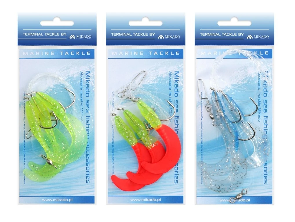 Rig für das Dorschangeln in drei verschiedenen Farben mit jeweils drei Twistern, welche an Haken der Größe 4/0 montiert sind.