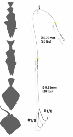 Dieses 110cm lange Brandungsvorfach besitzt 2 Haken der Größe 1/0. Die Hauptschnur ist 0,70mm (60lbs) stark und die Vorfachschnur 0,55mm (30lbs). Ideales Rig für das Boots- und Brandungsangeln auf Dorsch, Wittling, Plattfisch oder Wolfsbarsch. Die Lieferung erfolgt auf einem Aufwickler.